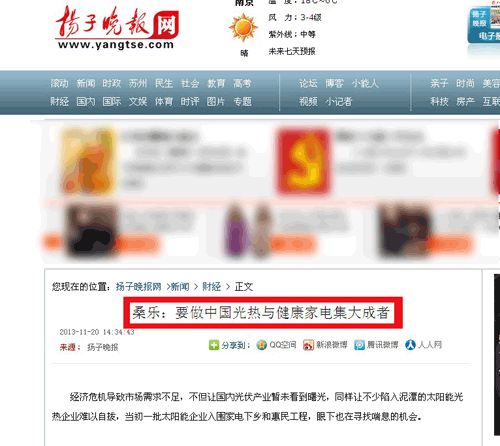 揚(yáng)子晚報(bào):桑樂要做中國光熱與健康家電集大成者